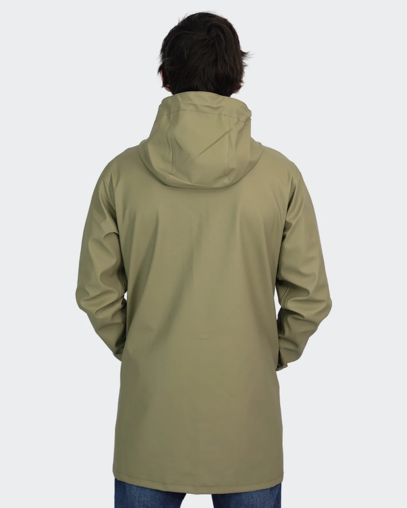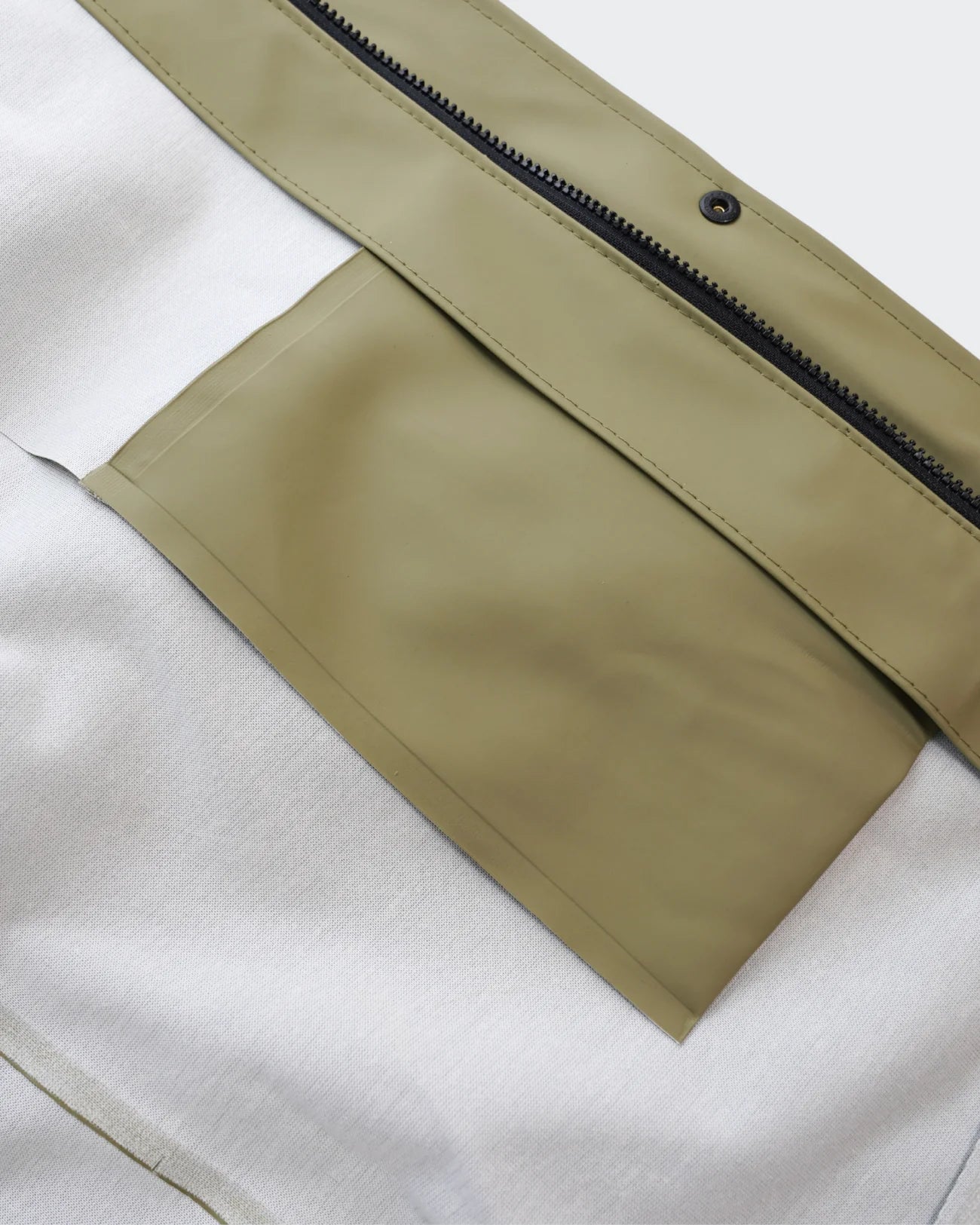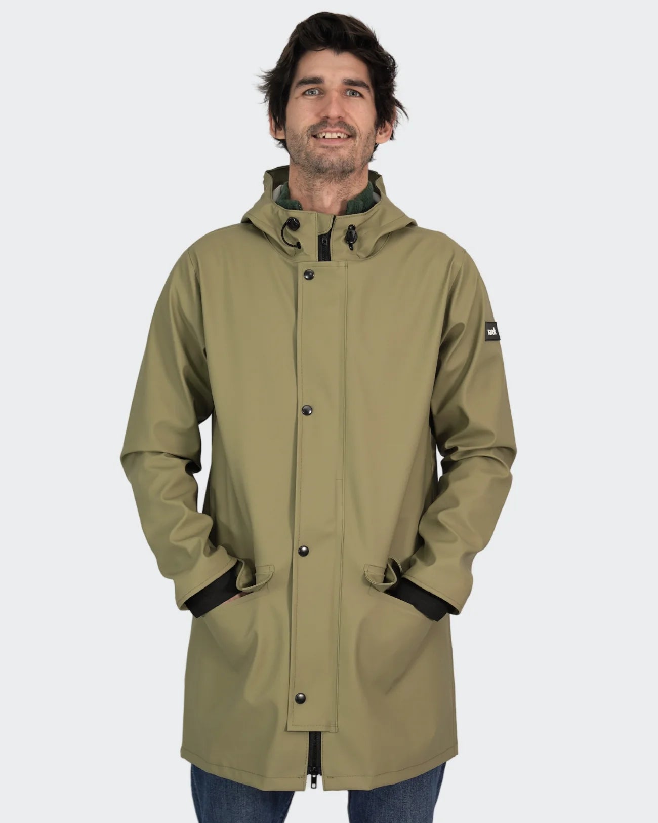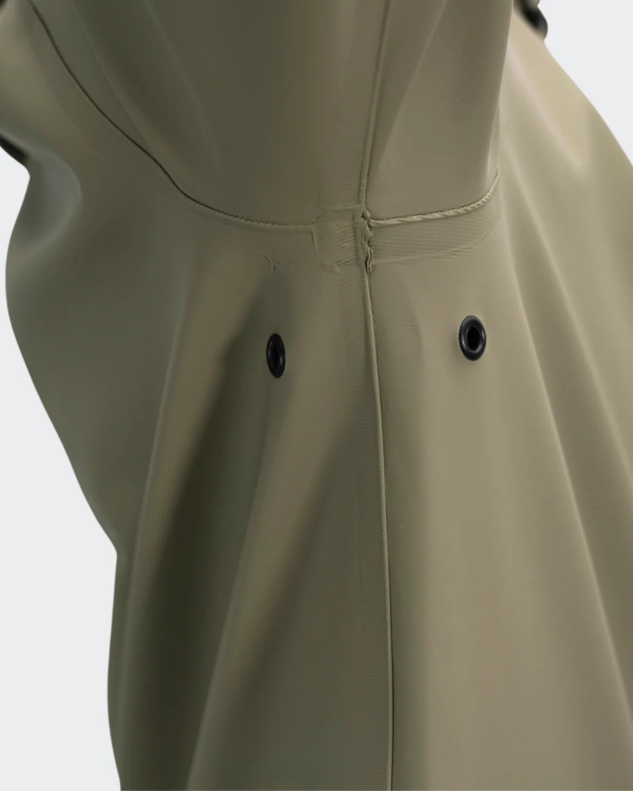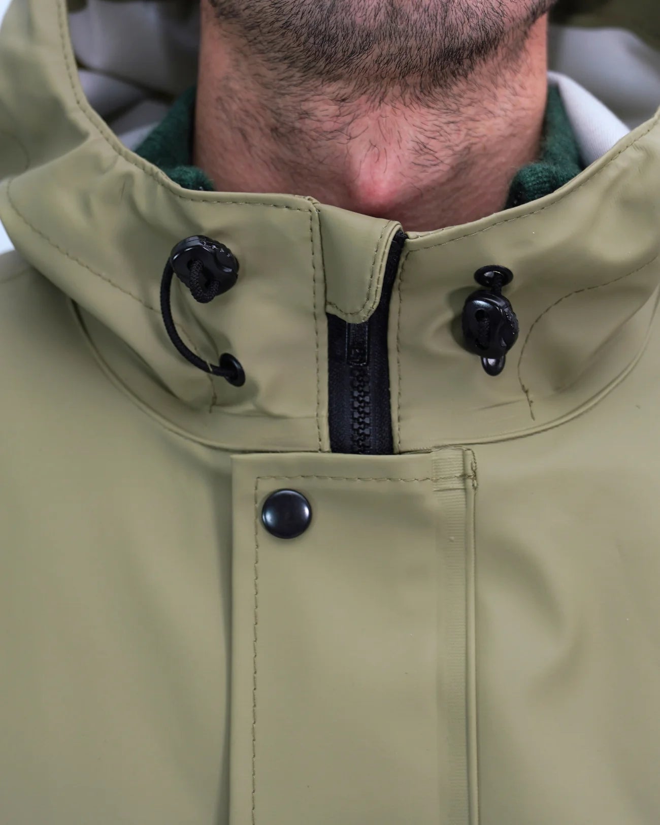 Ce ciré se présente comme une armure contre la pluie, avec sa toile imperméable épaisse de 380 gsm et ses coutures thermosoudées.