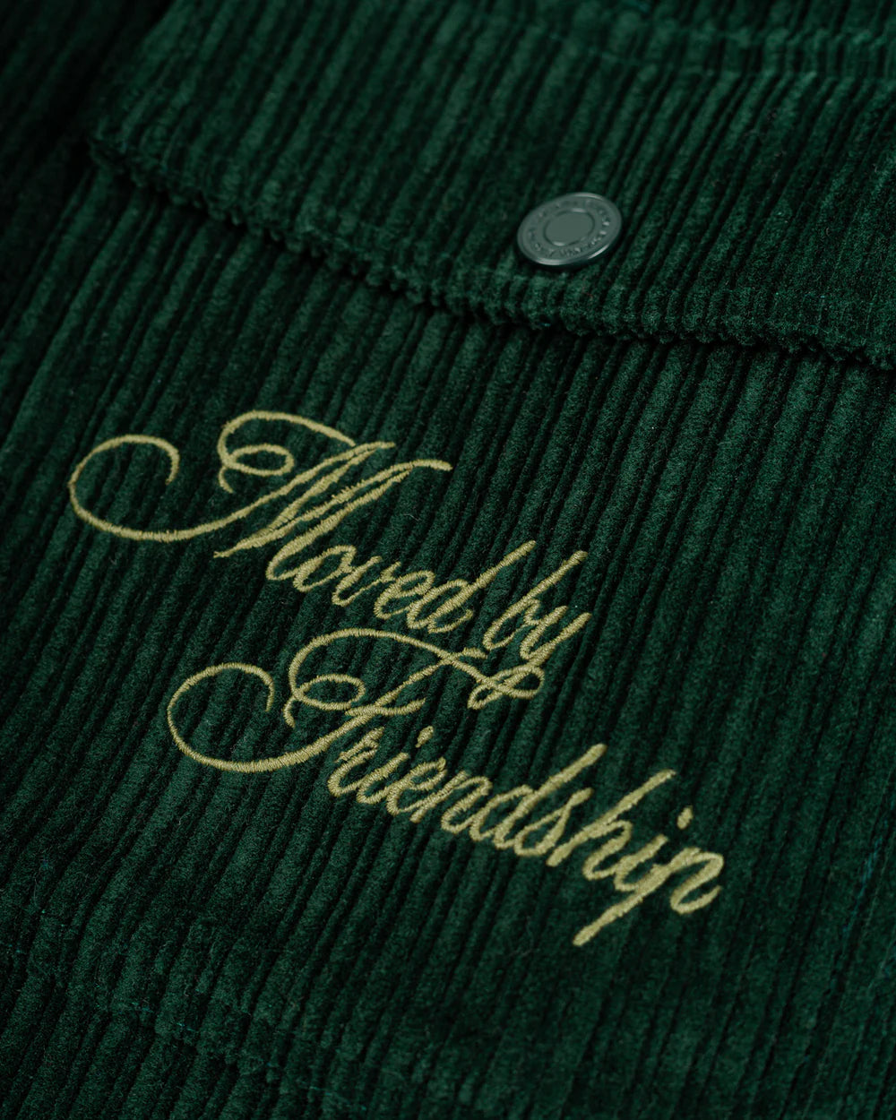 La coupe décontractée de cette veste en fait une pièce facile à porter au quotidien, idéale pour un look casual chic. Les fermetures par boutons-pression ajoutent une touche pratique et moderne, tandis que la broderie "Moved By Friendship" incarne l’ADN de la marque Ementa, entre esprit communautaire et streetwear engagé.